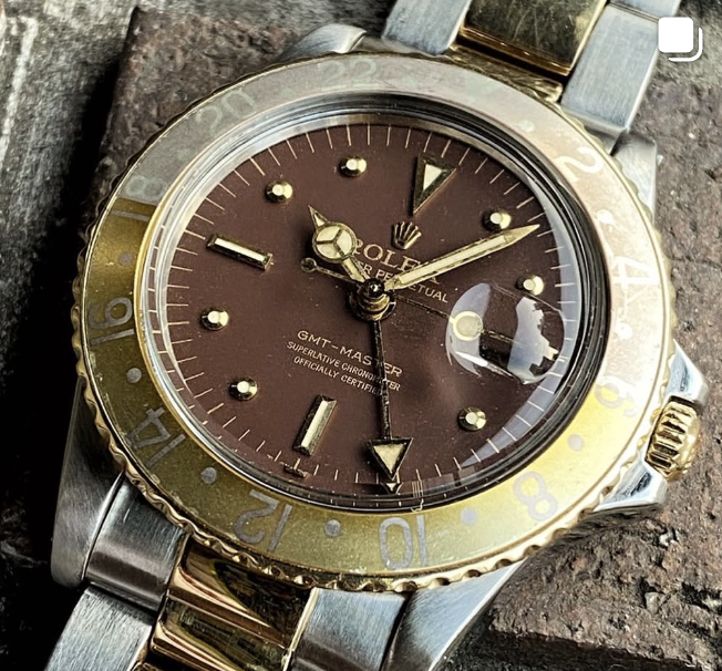 RARE & UNRESTORED 70's GMT MASTER GLOSSY BROWN FACE WATCH DIAL Ref 1675/3, 1675/8 IN GOLD....