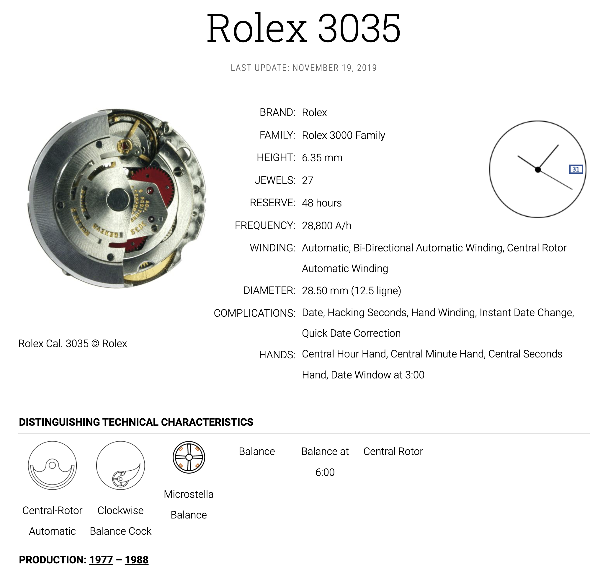 Trés rare mouvement automatique de montres Rolex ref 3135 avec disque dateur. Spiral...