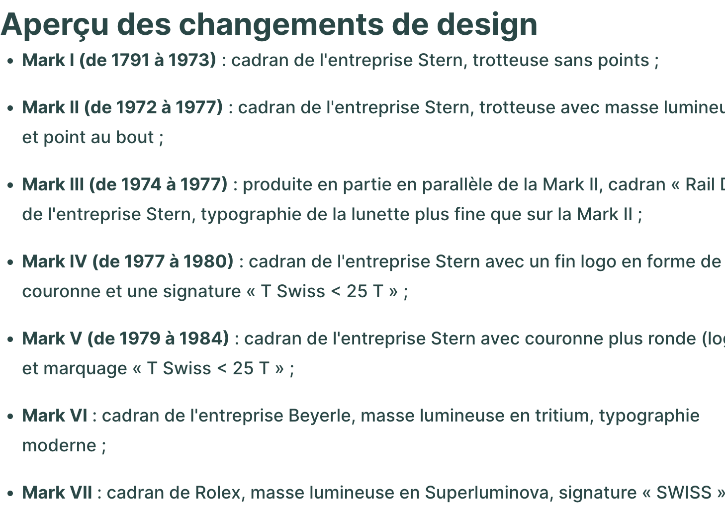 Mark V (de 1979 à 1984) : cadran de l'entreprise Stern avec couronne plus ronde (logo) et marquage « T Swiss < 25 T » ;