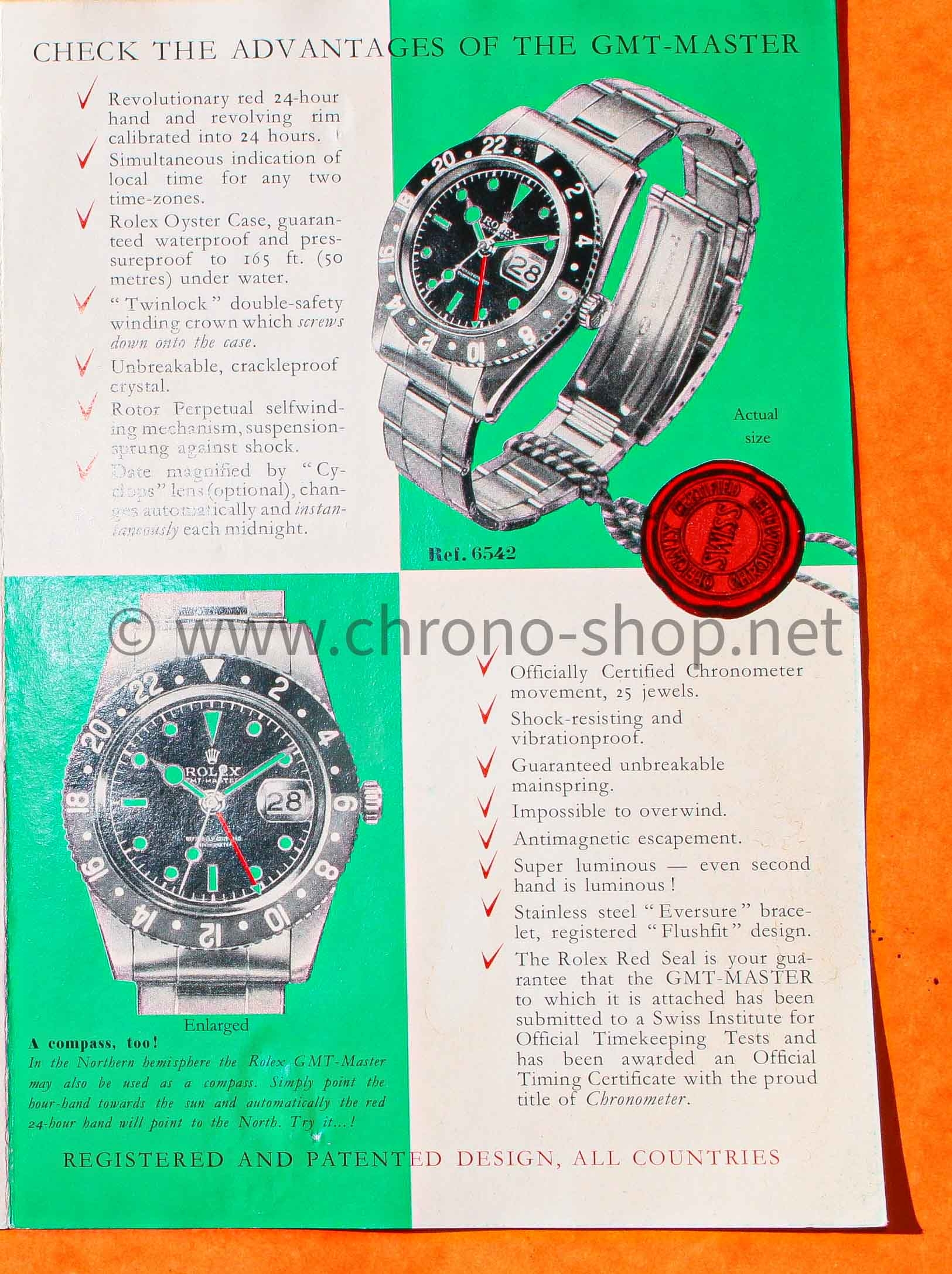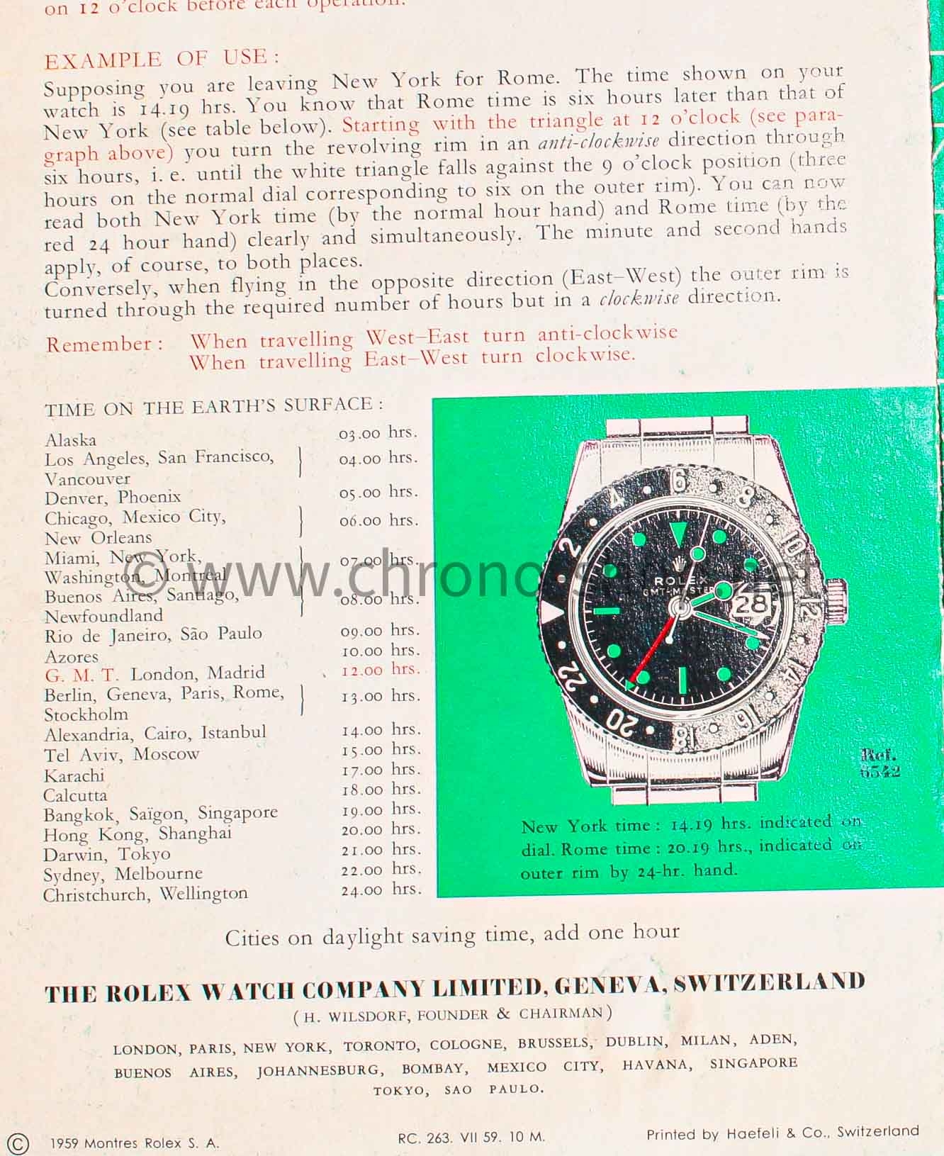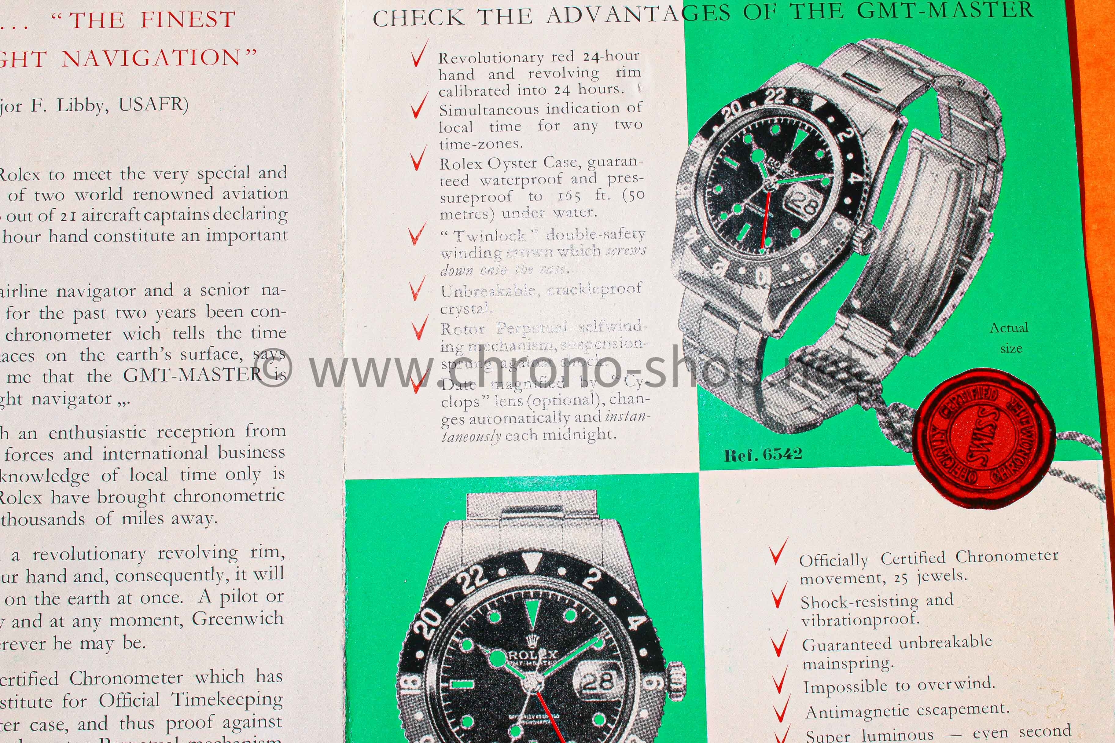 Il contient non seulement le manuel d'utilisation, mais aussi les décalages horaires dans différents fuseaux horaires, ainsi que les avantages liés à l'acquisition d'une GMT Master 6542 (double affichage des fuseaux horaires, étui Oyster, etc.).