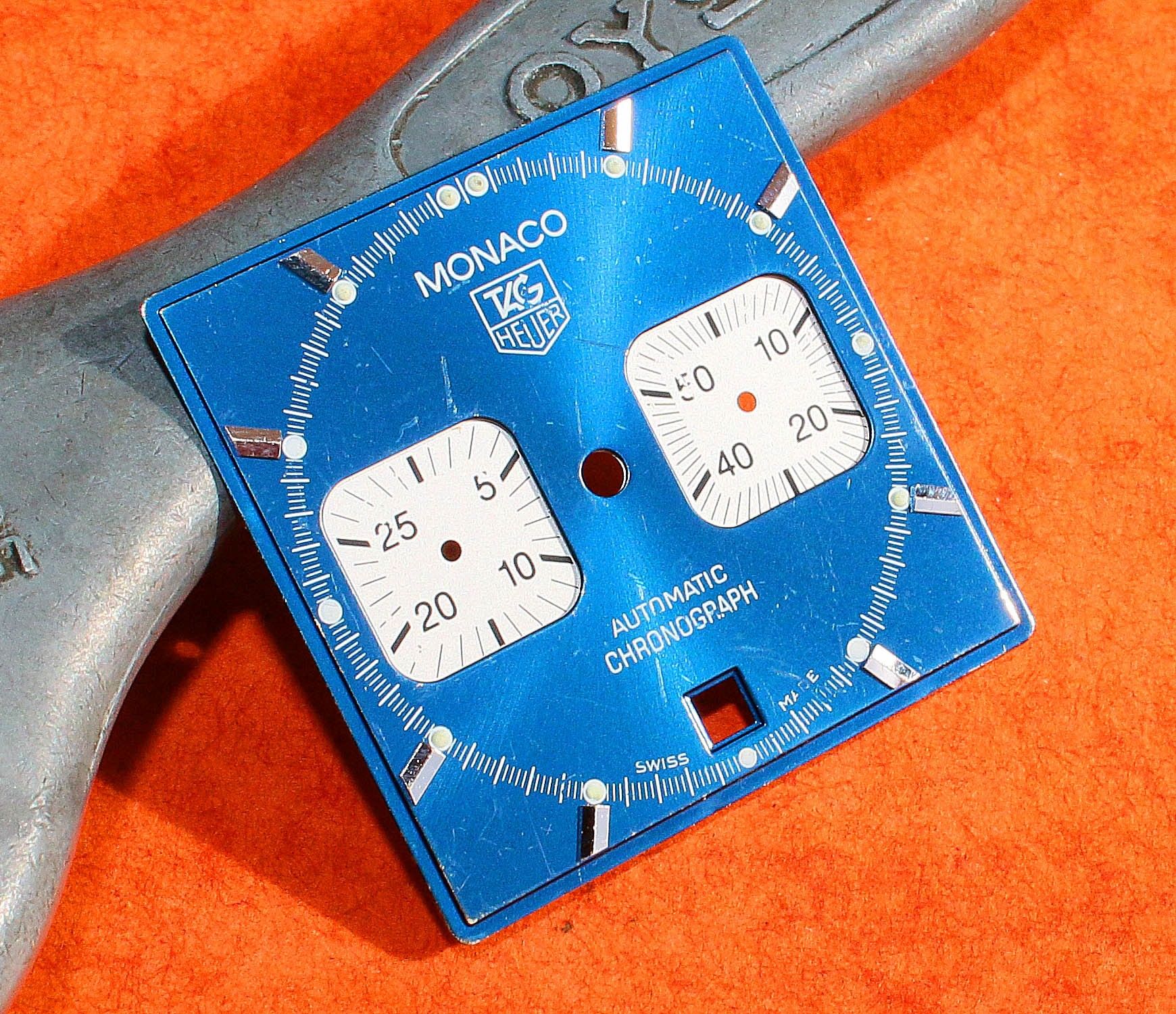 AUTHENTIC SWISS MADE ORIGINAL TAG HEUER MONACO BLUE DIAL WITH SILVER HOUR MARKERS AND THE LITTLE DOT ABOVE EACH MARKER GLOW GREEN IN THE DARK.