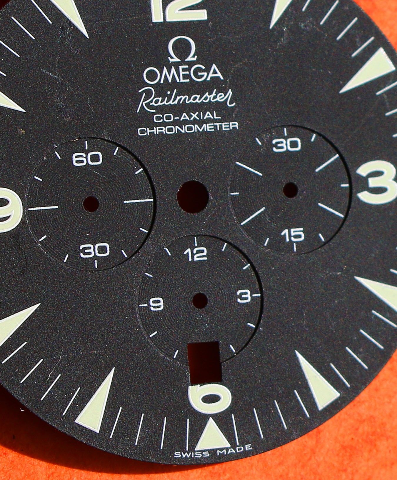 Limited version & rare to find an Omega Railmaster Co-Axial Automatic watch dial for sale in black color with luminous index & numbers.